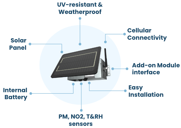 Clarity Node-S – A fixed-location, solar-powered ambient air quality monitoring platform used globally for industrial, boundary, and community monitoring applications.